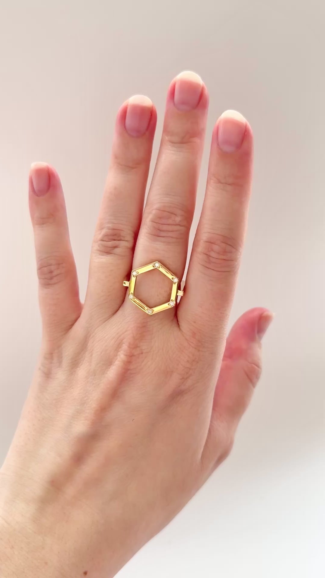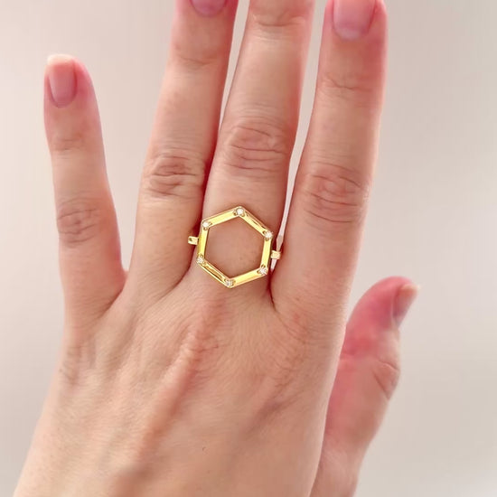 This folding statement silver ring features 6 lab grown diamonds on one side of the hexagon and plain on the other, offering two looks in one ring.